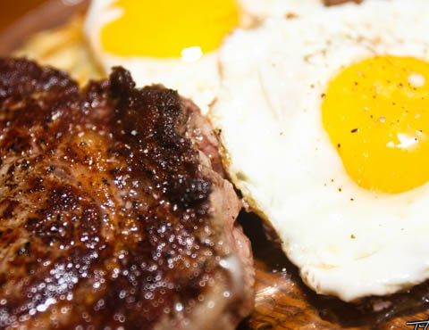 A 6oz striploin, rubbed in our secret spice blend and char-grilled to your liking. Served with three eggs, toast, home fries & baked beans. Served with toast.